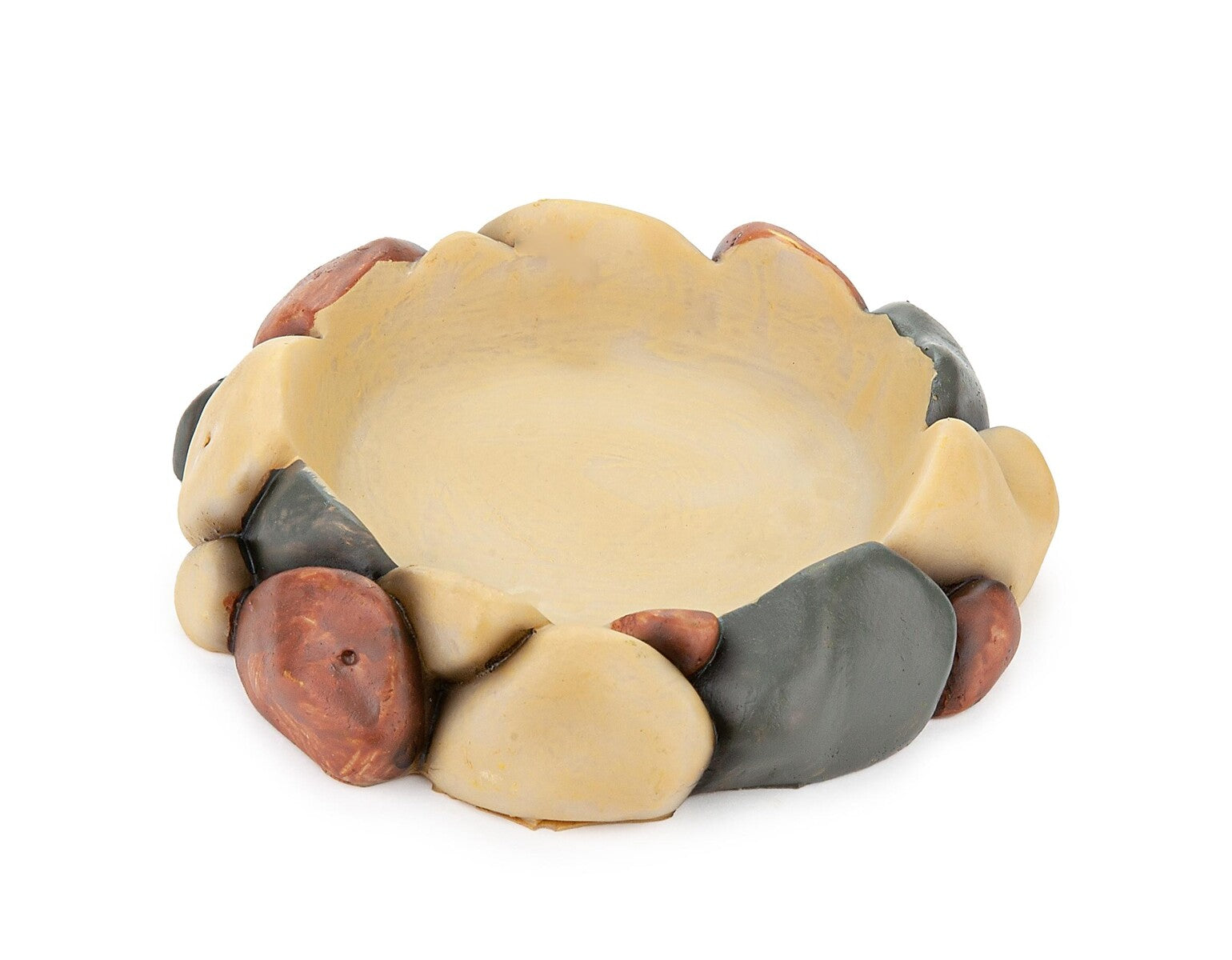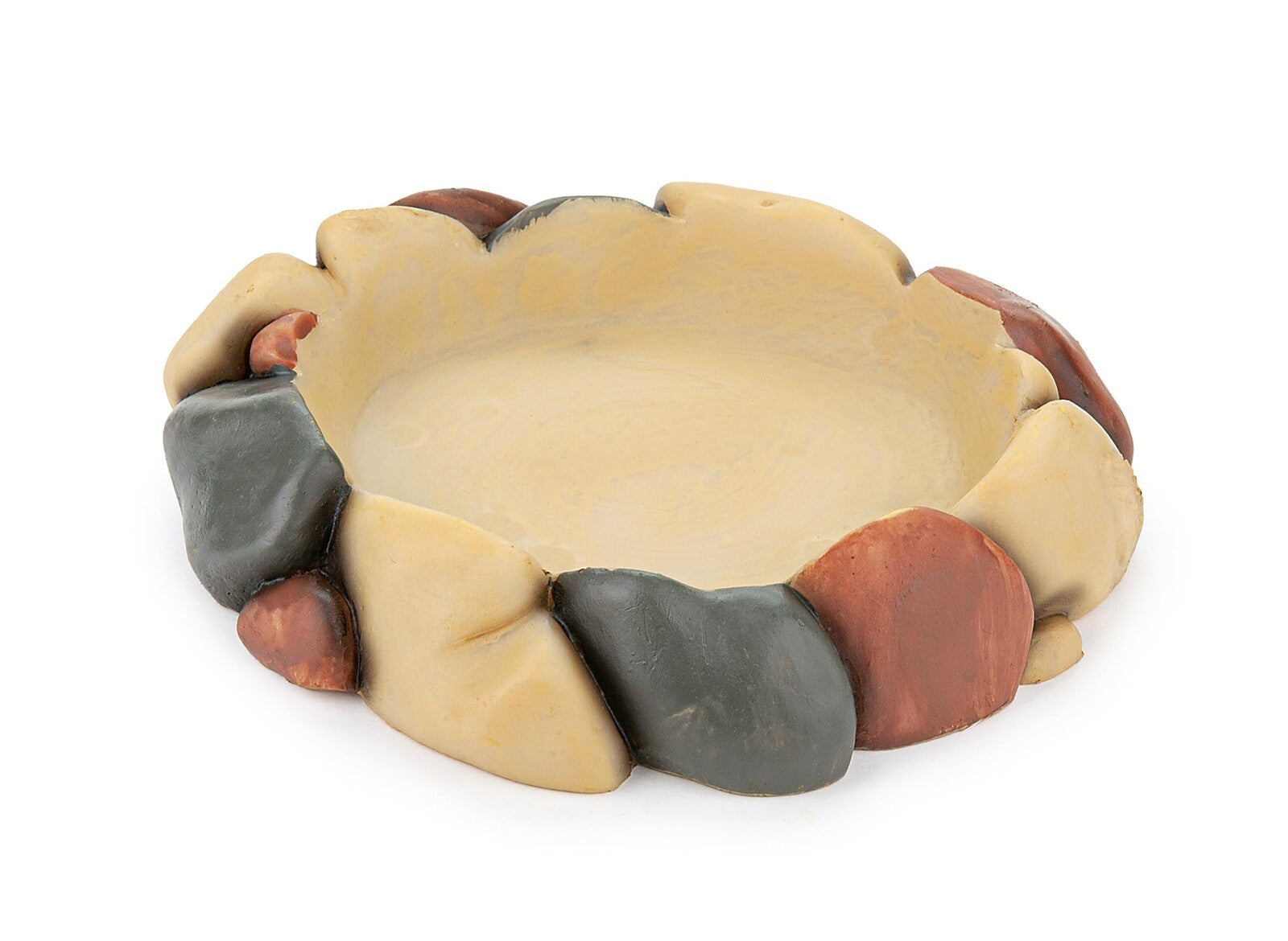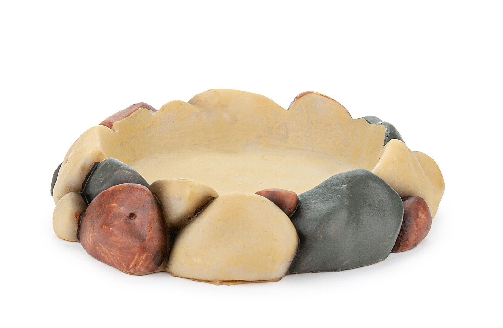 Estetiškai pagamintas terariumo dubuo, stilizuotas ant spalvingų akmenų, puikiai dera prie natūraliai sutvarkytos aplinkos.